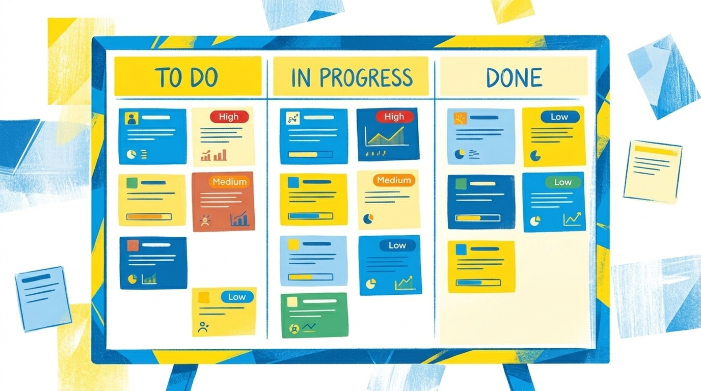 Füge jeder Karte ein Prioritätslabel hinzu: Hoch, Mittel, Niedrig.