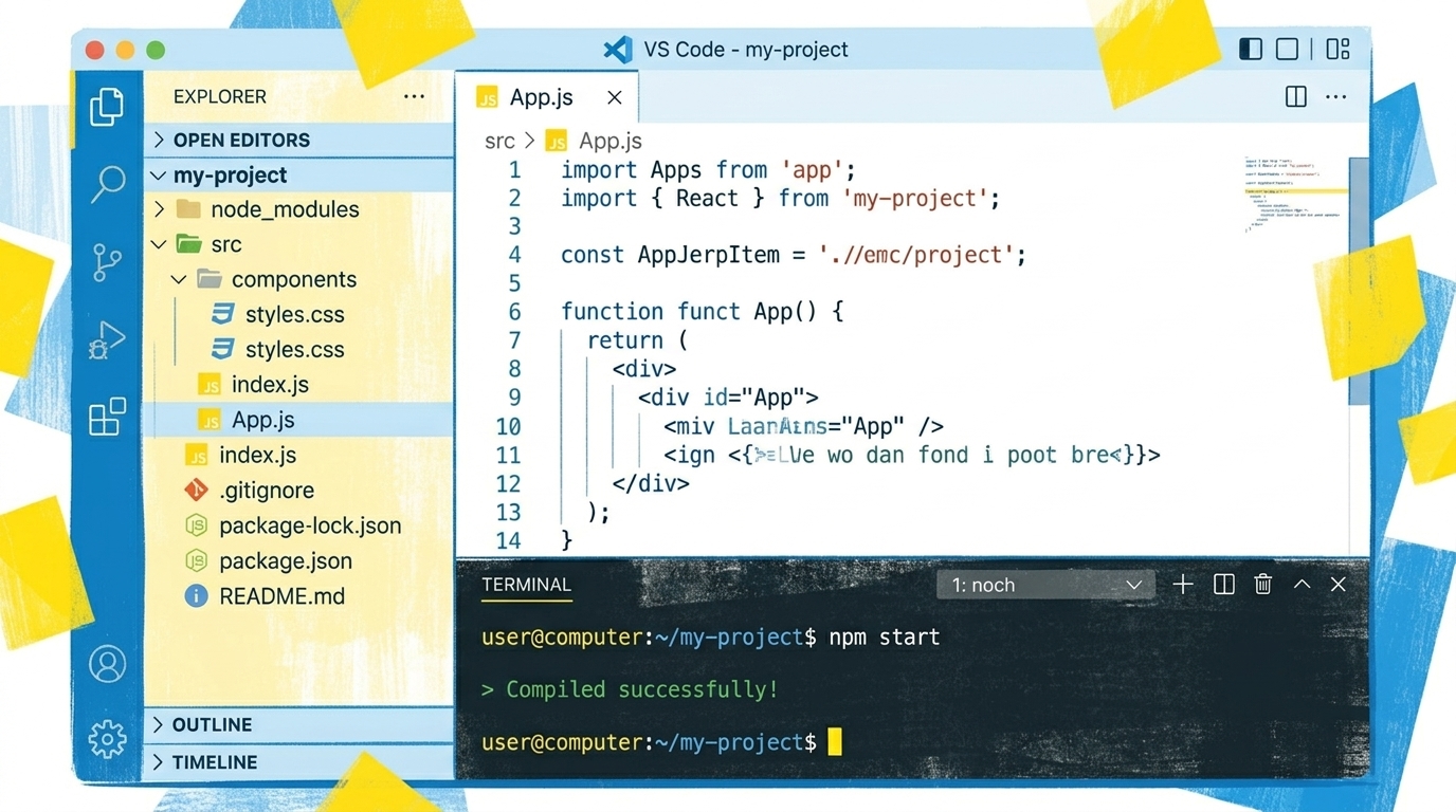 VS Code öffnet sich direkt mit deinem Projektordner. Im Explorer auf der linken Seite siehst du alle Dateien. Das Terminal unten ist automatisch auf diesen Ordner ausgerichtet. Perfekte Ausgangslage.